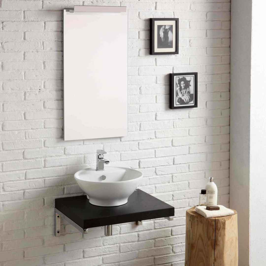 Composizione arredo bagno che comprende piano d'appoggio con altezza 10 cm in finitura rovere moro, staffe in metallo cromate con viti di fissaggio, lavabo in ceramica modello Momart, specchio da 45x90 cm e lampada con illuminazione a risparmio energetico. Questo progetto è stato ideato per un bagno semplice ed aggiornato nel design. Composizione Made in Italy.
