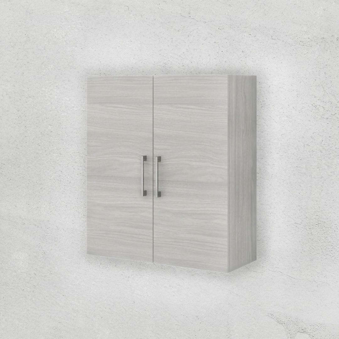 Il pensile bagno sospeso con doppia anta grigio quercia effetto legno è la soluzione ideale per coloro che vogliono arredare un piccolo bagno o un ambiente di servizio in modo funzionale. Questo armadietto a parete ha la struttura interamente in legno nobilitato con bordi in abs da 2mm ed una delicata finitura in legno grigio chiaro. All'interno dell'armadietto è collocata una mensola in vetro, mentre le maniglie dalla forma squadrata sono in abs cromato.