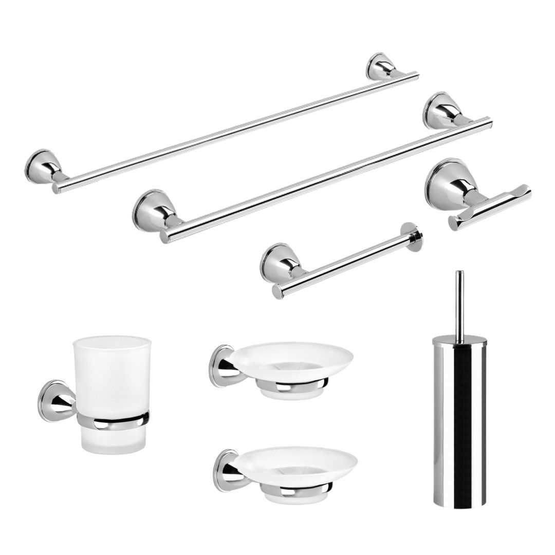 Accessori compresi: due portasapone, un portaspazolini, un appendino doppio, due portasalviette (uno da 30 cm e uno da 60 cm), un portarotolo, uno scopino per water.